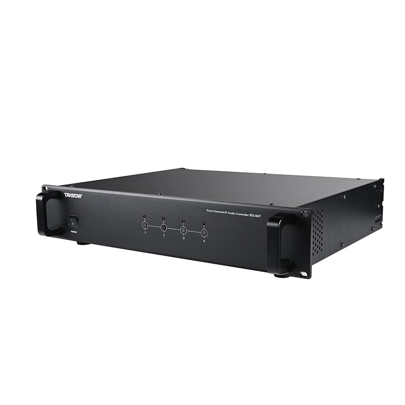 SG-04T Bộ điều khiển thông báo IP 4 kênh trong hệ thống âm thanh IP của Takstar, thiết bị hỗ trợ 04 ngõ vào mức Line, 04 ngõ vào Micro và 04 ngõ ra kết nối với amply analog thông thường.